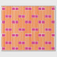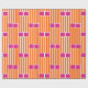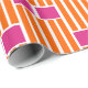 This wrapping paper has a mid-century modern design of orange vertical lines with pink rectangles above repeated over the design.