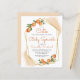 This citrus themed baby sprinkle invitation features a gold geometric frame adorned with watercolor oranges. The customisable text is in modern orange handwriting script and black sans serif. Personalise it with the name of the mum-to-be and shower details. The back of the card is a pastel shade of orange matching the watercolor highlights on the front. Ideal for a summer baby shower!