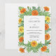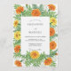 A vibrant autumnal design features a rich array of marigolds in shades of orange and yellow, interspersed with lush green foliage. The abundant blooms evoke a sense of warmth and natural beauty, perfect for a rustic fall gathering.