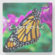 A close-up photo of a delicate, orange and black monarch butterfly resting on a bright magenta flower. "Explore" thoughts of warm, sunny days as you relax with your favourite beverage while using this stunning, colourful photography stone coaster. Makes a great gift for someone special!