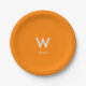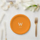 Trendy personal party paper plates featuring orange background, large centred monogram and associated name. Clean, simple minimalist typography. Fully personalizable.