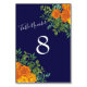 Orange & Navy Blue Peony & Rose Floral Wedding Table Number