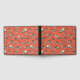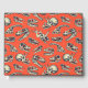 This guest book features hand-illustrated dinosaur skulls in navy blue and cream on a bright red-orange background.
