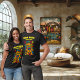 This bold orange alien lights up the black background with glowing yellow eyes and a neon zigzag smile in pink and blue. Surrounded by colourful abstract symbols, it’s a funky pop art design bursting with energy. Perfect for festivals, quirky streetwear, or anyone who loves bold statement t-shirts.