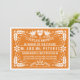 Orange papel picado love birds wedding couples shower invitation. It showcases two love birds and a love heart with the word love as well as flowers, leaves and small dots on orange background. This nature inspired Mexican folk art style floral wedding invite template design is great for a fall wedding.