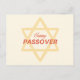 This postcard presents a minimalist and modern approach to Passover greetings. Dominating the design is a large, golden Star of David, its lines crisp and bold, creating an interplay of geometric symmetry and space. Superimposed upon the star is the phrase "Happy PASSOVER" in a contrasting red and gold font, which adds a touch of warmth and celebration to the card.