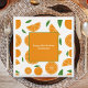 Napkins with a slice, half and full orange pattern. A customisable text is available at the centre on an orange background. A fresh decoration for a birthday party, a wedding, a housewarming party, a retirement, a bachelorette party, etc.