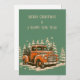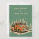 retro christmas card of an old orange pickup car in the snow and pine trees in the background