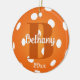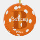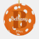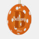 Personalised orange pickleball ornament with monogram, name and year for the pickleball enthusiast. The sample is shown on a round ceramic ornament--other ornament styles are available on the ordering page or the design can be transferred to other ornament styles or another product. ASSISTANCE: For help with design modification or personalisation, colour change, resizing, transferring the design to another product or you would like coordinating items, contact the designer BEFORE ORDERING via the Zazzle Chat MESSAGE tab below or email makeitaboutyoustore@gmail.com.
