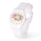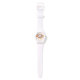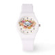 A watch with a peach and white striped pattern. Layered over top is an orange and pink floral arrangement with green leaves. A diamond shaped frame layered over top with your personalised name inside written in a curved text..