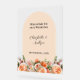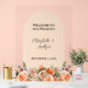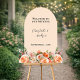 For an elegant and romantic wedding. A clear, transparent background decorated with orange, peach and pink florals. Arch shaped frame. Personalize and add your names and the date.