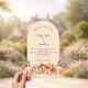 For an elegant and romantic wedding. A clear, transparent background decorated with orange, peach and pink florals. Arch shaped frame. Personalize and add your names and details.