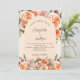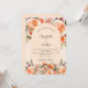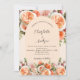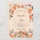 For an elegant and romantic wedding. A soft peach coloured background decorated with orange, peach and pink florals. Arch shaped frame. Personalise and add your names and details.