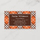This elegant and modern business card features a orange, black and white plaid background. The text combines modern sans serif fonts for a classy and sophisticated look.