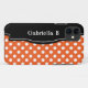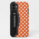 Stylish iPhone 5 case designed with a white polka dots over orange pattern, a black frame over the left side, and personalised with your name or custom text in white across the black frame. This design is perfect for vertical and horizontal use of the iPhone 5.