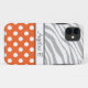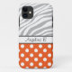 Custom iPhone 5 case personalised with your name, and designed with an orange & white polka dot pattern and a faded zebra print pattern with grey & white zebra stripes.