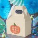 These cute fall baby shower favour boxes features a cute pumpkin and the words "A LITTLE PUMPKIN IS ON THE WAY!" in brown on one side, and the name of the mum-to-be and the baby shower date in white on the other side.