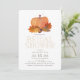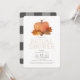 This chic bridal shower invitation features an orange pumpkin with autumn/fall leaves and an acorn on a white background. The reverse side features a white background with black buffalo/gingham check patterns. Personalise it for your needs. You can find matching products at my store.