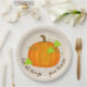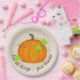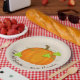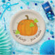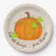 Orange pumpkin graphic with polka dot leaves on soft textured burlap background.