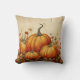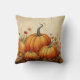 A pillow with a rustic illustration with orange pumpkins and fall leaves. An autumn grunge vibe.