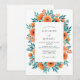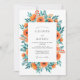 This design features a cluster of vibrant orange poppies and lush teal foliage. The watercolor aesthetic creates an airy and romantic mood perfect for a warm weather event. Bright tangerine petals are complemented by delicate greenery and budding wildflowers against a clean white backdrop.