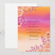 This design showcases a vibrant watercolor gradient transitioning from warm orange to deep magenta. Delicate peach roses and pink daisies are paired with purple eucalyptus leaves in a graceful arrangement. The bold ombre background creates a romantic atmosphere reminiscent of a tropical summer sunset.
