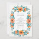 This botanical design features a vibrant arrangement of watercolor poppies and ranunculus in shades of orange and peach. The lush foliage is rendered in a soft dusty teal and deep forest green, creating a striking contrast. Ideal for a fresh spring or summer seasonal event, the artwork evokes a sense of airy romance and natural beauty.