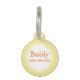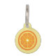 Cool cartoon illustration mimicking the look of a freshly cut delicious orange fruit. The background colour is light yellow. On the other side there are personalizable text areas for the name of the pet and for a phone number.