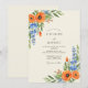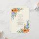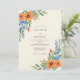 This botanical design showcases vibrant watercolor orange poppies and tall blue larkspur blooming across a warm cream surface. Lush green leaves and delicate stems provide a natural, airy feel to the floral arrangement. The palette features bold citrus tones paired with cool cornflower blues for a joyful and sun-drenched aesthetic.