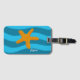 A luggage tag with some beach vibes featuring a watercolor orange starfish on a blue wavy background . Personalize it with a name .