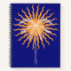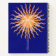 A white line art palm tree overlaid on an orange sun with wavy rays, resting on a purple blue back ground. Choose from sketchbook, bullet journal, checklist, graph paper, recipe book, or lines in various widths and colours. Also choose a spine colour to further customise your notebook look.