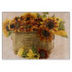 A still life of a tin basket filled with orange sunflowers with a textured background.