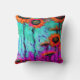 Contemporary modern art work of colourful orange sunflowers with purple shadows on a turquoise throw pillow. Please NOTe: The front and back of pillow have different images of the same flowers and colours.