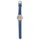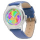 Orange Dinosaur custom Boy's Name Jimmy. Cool orange T-Rex Dinosaur rainbow colour watch for kids with fully customisable boy's name "Jimmy". A super cool cartoon dinosaur T-Rex and rainbow colours border with colourful numbers 1 to 12 wrist watch with blue strap. This beautiful kid's dinosaurs watch for children is fully customisable and personalizable, add your name, text(s) and images! A beautiful dinosaur gift for the big little dinos fan!