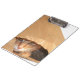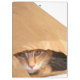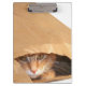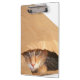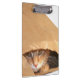 Orange tabby kitty cat peeks out of one of a cats favourite toys......a brown paper sack or bag......cat lovers clipboard