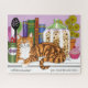 Orange tabby cat sitting on a kitchen counter top. The cat thinks it is so funny that you want him off the counter. Books, cookies, plant and utensils are all around the cat on the counter in a backdrop of purple.