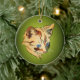 This Christmas ornament features the portrait of an adorable orange tabby kitten with soulful blue eyes set against a seasonal green background. Text on the reverse is easy to customise.