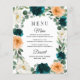 Orange Teal Turquoise Blue Boho Wedding Menu Cards - feature an elegant eucalyptus and greenery wreath decorated with ivory/white, orange and deep teal/turquoise flowers. View the matching collection on this page to find coordinating products to complete the theme with this design.