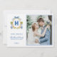 This photo card has a preppy grandmillennial design featuring an orange toipiary crest with a Chinoiserie ginger jar surrounding a bamboo crest. The bottom has blue text that says "Merry Christmas." You can personalise with a name, year and your initial. The back has a bamboo striped pattern.
