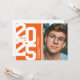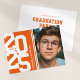 Modern orange graduation party invitations featuring an eye-catching class year layout in a varsity font, a photo of the grad, two white stripes, their name, school, and an easily personalised party invite template, these sporty invites will make your celebration a memorable one.