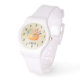 Personalised watch with a watercolor illustration of an orange pumpkin decorated with colourful fall leaves and sprigs. Background is a digital image of a faux parchment texture created with watercolors. Art deco clock face.