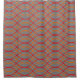 This shower curtain has a Boho design of orange and red waves on a field of grey.