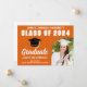 This modern orange and white custom senior graduation party invitation and graduate announcement features classy white typography of your college name for the class of 2024. Customize with your graduating year under the chic black handwritten script and black grad cap for great cards. Add your party details on the back.