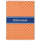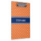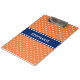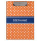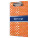 Personalised orange and white polka dot pattern with royal blue accent clipboard. Small white polka dots on orange and in the middle there is a royal blue band to put your custom name in.