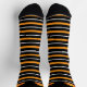 Perfect for Fall, these socks have an orange and white striped pattern, over a black background. At the top of each sock there is a pumpkin still life.