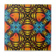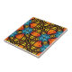 This ceramic til features a beautiful pattern that draws the eye into a dance of colour and shape. The intricate design is chraacterised by symmetrical arrangements of vibrant hues, creating an optical illusion effect. The fiery orange shapes, resembling eyes or leaves, are central in the pattern, radiating a sense of warmth and energy. These are accentuated by radiant yellow lines that add contrast and highlight the geometry of the design. Cool blue tones introduce depth to the tile, appearing like blossoming flowers or stars amidst the vibrancy. These elements are outlined and defined by deep black lines, adding visual structure and enhancing the overall effect.