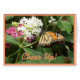 A Monarch butterfly's pattern of orange, gold and black resembles stained glass on pink and white blooms.