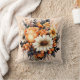 Pillow with an elegant yet goth style flower bouquet. Composed of orange tulips, yellow daisies, grey leaves and sprigs and some orange berry accents.