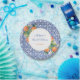 Handpainted oranges against a background pattern based on a vintage blue and white tile. If you prefer the centre circle with a plain edge (rather than scalloped), this option is available. Underneath the text customisation boxes, "click to customise further" then go to the "layers" area and unhide the "oval" and hide the scalloped circle layer.