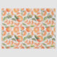Craft or gift-wrapping tissue paper with brightly coloured oranges and green leaves on a white background.